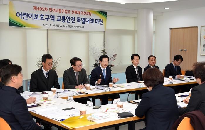 경기 의정부시는 10일 시청 문향재에서 어린이보호구역 교통안전 특별대책 마련을 주제로 '제405차 안전교통건설국 조찬포럼'을 개최했다. 포럼에는 안병용 시장, 황범순 부시장을 비롯한 공무원, 의정부시의회, 의정부경찰서, 의정부교육지원청, 교통안전전문가 등 관계기관 단체대표 20여명이 참석했다. 사진은 안 시장(가운데)이 발언하는 모습. (사진제공=의정부시청)