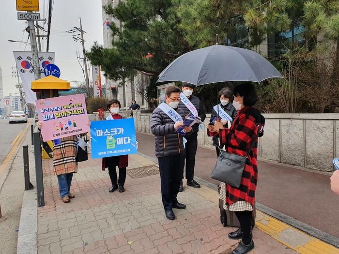 경기 수원시 팔달구 인계동 지역사회보장협의체는 12일 뉴코아아울렛 앞 사거리에서 복지사각지대 발굴 및 마스크 착용 캠페인을 실시했다. 협의체 위원들이 홍보 피켓을 들고 지나가는 시민들에게 리플릿과 마스크를 전달하고 있는 모습. (사진제공=팔달구청)