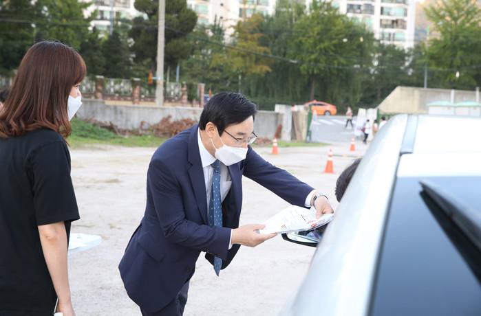 서울 도봉구는 최근 성대구장(도봉동)에서 ‘비대면 자동차 극장’ 영화 상영을 개최했다. 안전하게 차량 안에서 공연과 영화를 관람할 수 있어 주민들의 관심이 높았다. 사진은 이동진 구청장(오른쪽)이 '비대면 자동차 극장 관람 안내문'을 나눠주고 있는 모습. (사진제공=도봉구청)