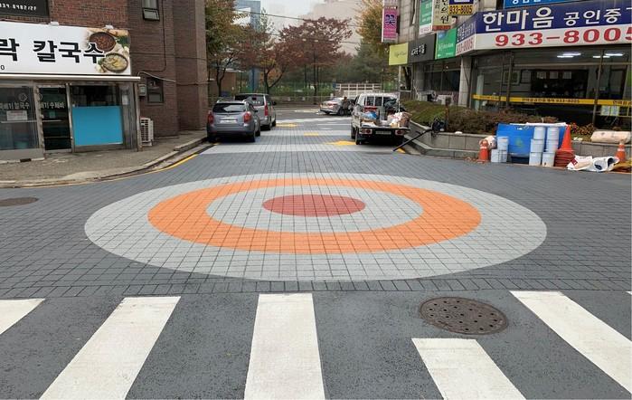 다양한 컬러, 문양으로 도로를 포장해 밝은 도로환경으로 조성했고, 자연스레 자동차 주행 속도도 줄이도록 유도했다.