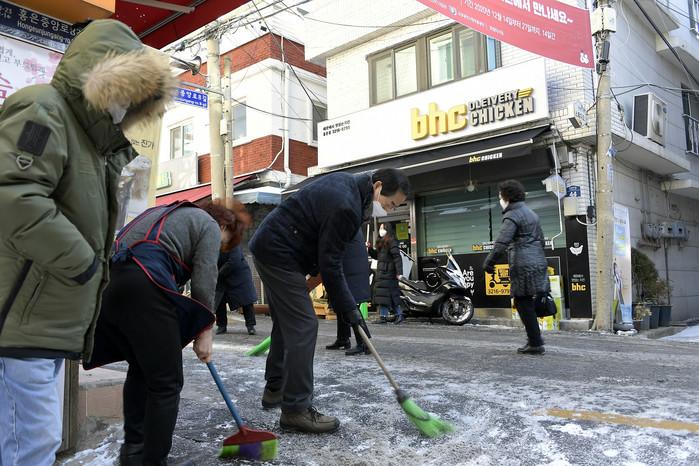 ▲ 문석진 구청장이 7일 오전 지역내 홍은1동 포방터시장 인근에서 구청 직원 및 상인들과 함께 제설작업을 펼치고 있다. (사진제공=서대문구청) |