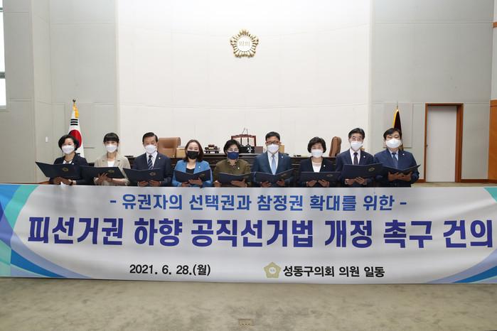 이에 구의회는 현재 코로나19로 청년들의 우울감과 어려움은 점점 커져가고 있는 반면 청년을 대변할 청년의원의 수는 저조하기 때문에, 국민 대표로서의 의무와 사명감을 갖고 청년이 정치에 참여할 수 있도록 선거권과 동일하게 18세 이상으로 하향 개정해줄 것을 촉구했다.