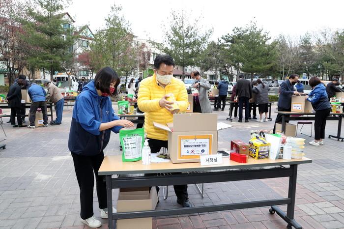경기 구리시가 최근 시 종합사회복지관에서 코로나19 극복을 위한 긴급 생필품 키트를 제작했다. 이날 안승남 시장을 비롯해 장애인복지관 관계자 등이 제작한 키트는 소상공인 등 300가구에 전달될 예정이다. 사진은 안 시장이 생필품 키트를 제작하는 모습. (사진제공=구리시청)