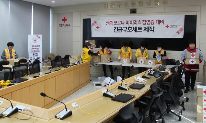 대한적십자사 서울지사가 신종 코로나바이러스 확산 방지를 위해 총력을 다하고 있는 가운데 지난 7일 적십자 직원들과 봉사원들이 마스크 5개, 손소독제, 햇반 3개, 생수 2개로 구성된 감염병 긴급구호세트를 제작했다. 사진은 참여자들이 구호세트를 제작하고 있는 모습. (사진제공=대한적십자사 서울시지사)