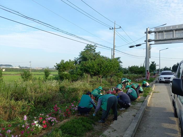 충남 아산시 둔포면 새마을 남·여협의회가 지난 20일에 산전사거리 인근 가로화단 제초작업과 쓰레기 수거 환경정화 활동을 실시했다. 사진은 이날 회원들이 가로화단에서 제초작업을 하고 있는 모습. (사진제공=아산시청)