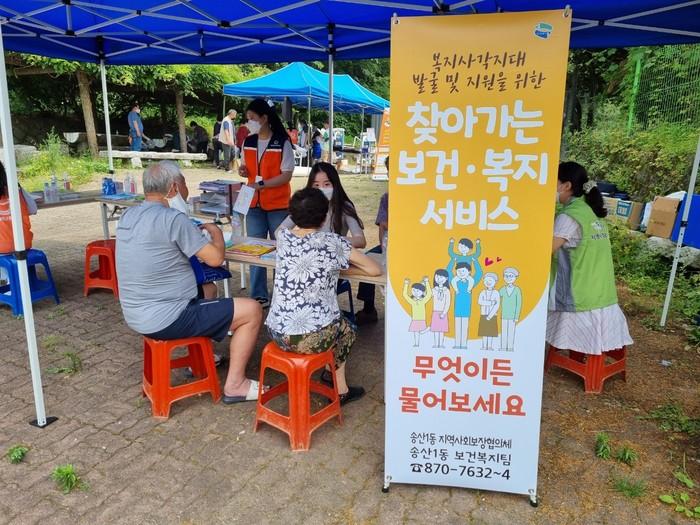 경기 의정부시 송산1동은 최근 거동이 어려운 복지취약계층이 밀집돼 있는 고산동 빼뻘마을에 찾아가는 복지상담 부스를 설치해 지역주민 복지상담 및 복지사각지대 발굴 캠페인을 벌였다. 사진은 이날 상담부스에서 주민들이 상담을 하고 있는 모습. (사진제공=의정부시청)