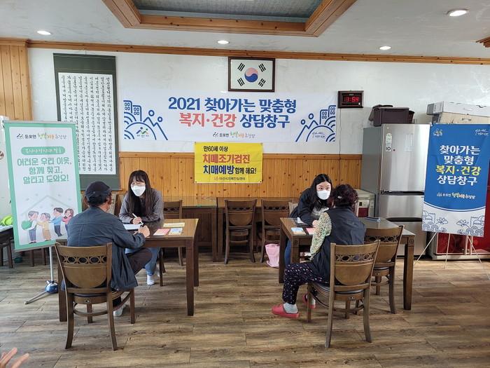 충남 아산시 둔포면행정복지센터와 둔포면 행복키움추진단이 26일 관대리 경로당에서 '찾아가는 보건·복지 상담 창구'를 운영했다. 찾아가는 상담창구에서는 달라진 복지제도에 대한 안내와 함께 우리의 이웃을 돕는 방법과 절차 등에 대한 안내도 병행하며 동절기 대비 복지 사각지대 발굴 활동을 진행했다. 사진은 상담 창구 운영 모습. (사진제공=아산시청)