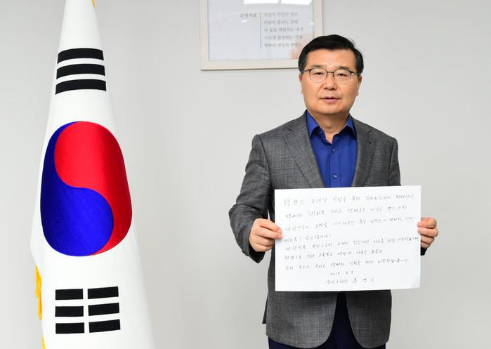 최근 류경기 서울 중랑구청장은 김선갑 광진구청장으로부터 지목받아 ‘평화의 소녀상 건립 해외도시 응원 챌린지’에 동참했다. 사진은 류 구청장이 응원메시지를 들고 기념촬영을 하고 있는 모습. (사진제공=중랑구청)