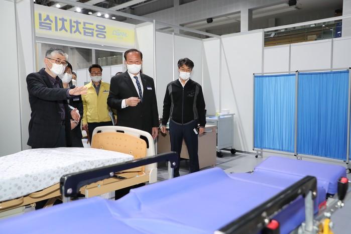 유동균 서울 마포구청장은 최근 마포구민체육센터에 설치된 코로나19 예방접종센터를 찾아 최종점검을 실시해 접종의 전과정을 꼼꼼하게 살폈다. 사진은 이날 유 구청장(가운데)이 응급처치실을 살펴보고 있는 모습. (사진제공=마포구청)