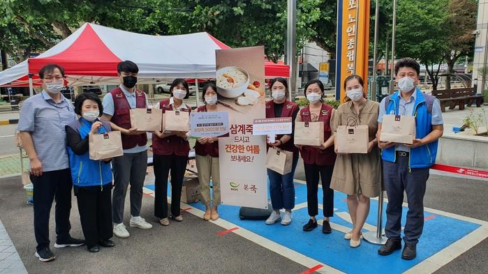 영등포구는 최근 본그룹으로부터 보양죽 500인분을 지원받았다. 보양죽은 영등포노인종합복지관과 영등포구 사회복지협의회에 250개씩 전달된다. 사진은 전달식에 참석한 관계자들이 기념촬영을 하는 모습. (사진제공=영등포구청)