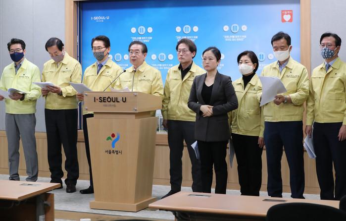 박원순 서울시장이 2일 오전 서울시청 브리핑룸에서 조희연 서울시교육감과 김영종 종로구청장 등 자치구청장들과 함께 초·중·고 온라인 개학과 관련해 노트북 등 학습기기 마련과 학교 소독 등 협력 방안을 발표하고 있다.