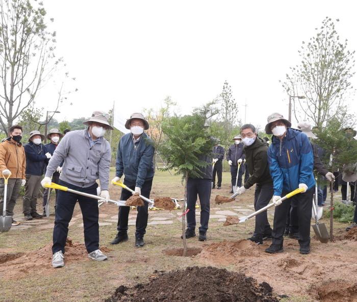 인천 서구는 30일 산림청과 인천시, (사)한국합판보드협회와 함께 석남녹지에서 ‘탄소중립 숲 나무심기 행사’를 열어 (사)한국합판보드협회에서 기증한 7년생 편백나무 100주를 심었다. 사진은 이날 행사에서 이재현 구청장(오른쪽)이 관계자들과 편백나무를 심고 있는 모습. (사진제공=서구청)