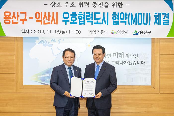 용산구가 18일 전북 익산시와 상호 우호 협력 증진을 위한 우호협력도시 협약을 체결했다. 이날 협약식에는 성장현 구청장, 정헌율 시장, 관계 공무원 등 30명이 참석했다. 사진은 협약 후 성 구청장(오른쪽)과 정 시장의 기념촬영 모습. (사진제공=용산구청)