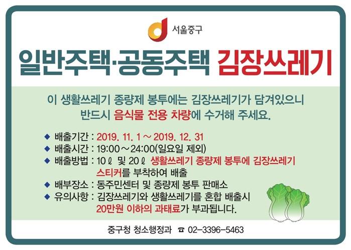 [시민일보 = 여영준 기자] 서울 중구(구청장 서양호)는 오는 12월31일까지 김장쓰레기 전용스티커를 부착하면 일반종량제 봉투로도 김장쓰레기를 배출할 수 있다고 밝혔다.