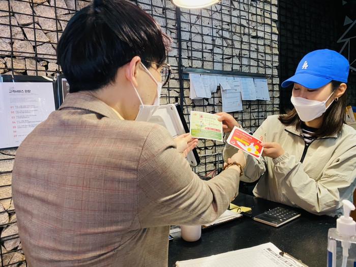 경기 동두천시 무한돌봄센터는 최근 이웃사랑을 실천하고 있는 착한식당을 대상으로 복지사각지대 발굴 홍보활동을 진행했다. 이날 무한돌봄센터 직원들은 어려운 이웃돕기 활동에 수년째 동참 중인 교촌치킨 송내점 등을 방문해 복지위기가구 제보 전화번호 스티커와 안내문 비치를 요청했다. 사진은 돌봄센터 직원이 점주에게 스티커를 건네는 모습. (사진제공=동두천시청)
