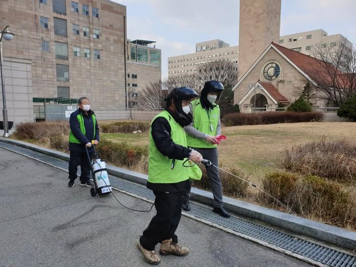 서울 광진구가 최근 코로나19 확산 방지를 위해 지역주민으로 구성된 지역자율방재단과 함께 세종대학교 유학생 선별 진료소 주변 방역소독 활동을 실시했다. 사진은 세종대학교 유학생 선별진료소 주변 지역자율방재단이 방역소독을 진행하는 모습. (사진제공=광진구청)