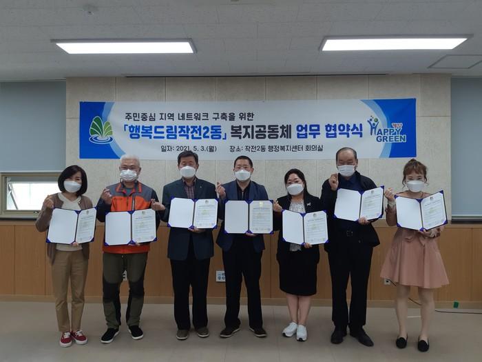 인천 계양구 작전2동행정복지센터와 동 보장협의체가 최근 지역내 사회단체, 노인복지시설, 고시원 등과 주민 중심의 복지공동체 구축을 위한 '행복드림작전2동' 업무 협약을 체결했다. 이번 협약으로 복지사각지대 해소, 돌봄기능 활성화를 위한 인적·물적 자원을 확보하게 됐다. 사진은 협약 체결 후 관계자들이 기념촬영을 하는 모습. (사진제공=인천 계양구청)