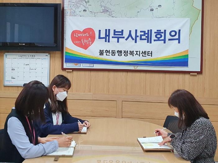 경기 동두천시 불현동행정복지센터는 최근 내부사례회의를 열고 경제적 어려움으로 고통을 겪고 있는 한부모 가족을 신규로 발굴해 가구의 위기상황 해소 및 지원 방향에 대해 논의했다. 사진은 이날 회의가 진행되고 있는 모습. (사진제공=동두천시청)