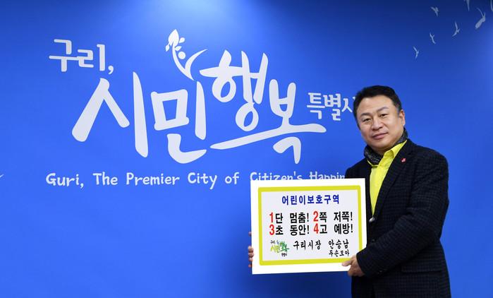 안승남 경기 구리시장은 21일 행정안전부가 어린이보호구역내 교통안전 실천문화 정착을 위해 추진하고 있는 ‘어린이 교통안전 릴레이 챌린지’에 동참했다. 사진은 안 시장이 '1단 멈춤! 2쪽 저쪽! 3초 동안! 4고 예방!’구호'를 들고 있는 모습. (사진제공=구리시청)