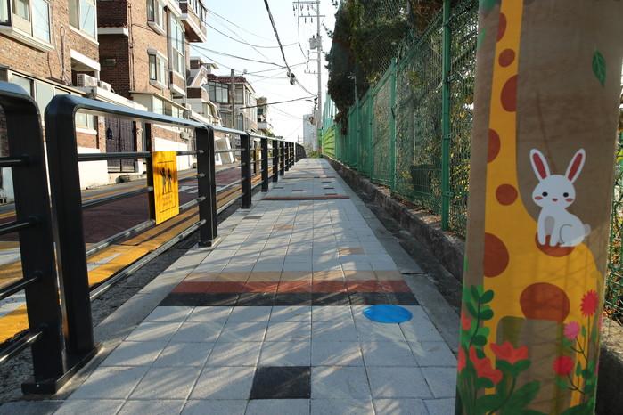 방치된 폐건전지함 등 아이들의 통행이나 안전에 저해가 될 만한 시설물을 정비하고, 도로경계석 안쪽 설치됐던 안전휀스 67개를 끝 쪽으로 이동시켜 통학로를 확보해 50미터 구간 전체 보도블럭을 밝은 디자인의 새블럭으로 교체했다.