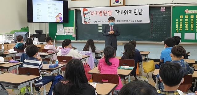[해남=정찬남 기자] 전라남도해남교육지원청(교육장 장성모)은 해남 학생이 배움의 주체로서 무한히 상상하고 질문하며 꿈을 실현하기 위한‘해남 학생과 세상 사람의 만남’프로그램 일환으로 28일(수) ‘아기별 탄생’작가인 강상구 해남군 부군수와 해남 아이들의 만남의 시간을 가졌다.