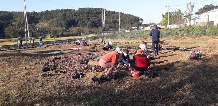 인천 강화군 교동면주민자치위원회는 최근 지역 주민들의 마음치유(힐링) 공간 마련을 위해 꽃동산을 조성했다. 위원회는 제초작업을 시작으로 12일 국화꽃 5000본 식재를 완료해 꽃동산을 조성했다. 사진은 이날 참여자들이 국화꽃을 심고 있는 모습. (사진제공=강화군청)