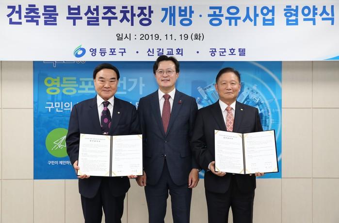 [시민일보 = 황혜빈 기자] 서울 영등포구(구청장 채현일)가 19일 신길교회(영등포로67가길 9) 및 공군호텔(여의대방로 259)과 함께 ‘건축물 부설주차장 개방·공유 사업 업무협약’을 체결했다.