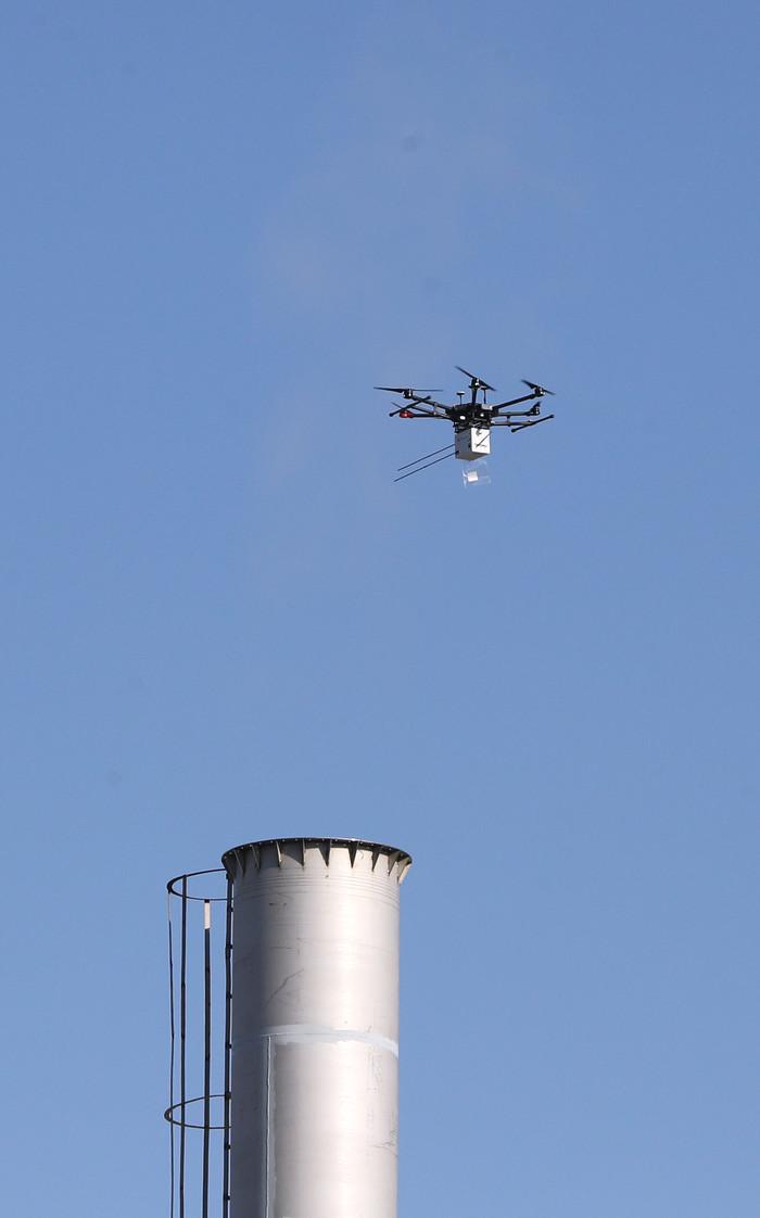 12일 서울 송파구 장지동 일대에서 환경부 수도권대기환경청 드론이 대기배출사업장 주변을 비행하며 감시활동을 벌이고 배출공기를 포집하고 있다.