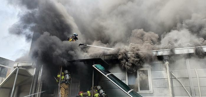 15일 오전 11시5분께 대구 북구 침산동 한 식품공장에서 불이 나 직원 등 20여명이 대피했다. 사진은 화재 진화 모습.