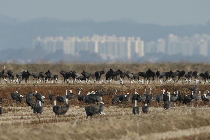 [서산=최진우 기자] 충남 서산시 천수만에 국제적보호종 및 천연기념물과 멸종위기야생동식물로 지정해 보호하고 있는 흑두루미(Hooded Crane) 4800개체 이상이 몰려들어 장관을 이루고 있다.