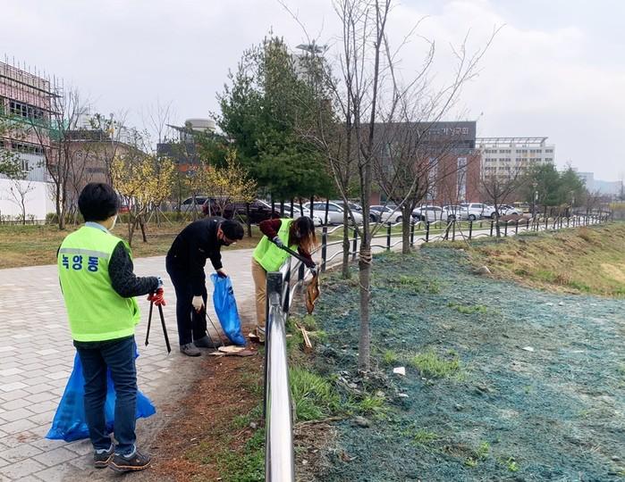경기 의정부시 녹양동이 최근 'The G&B City' 프로젝트 사업대상지인 녹양천과 장미터널 일대 환경을 정비했다. 이날 동장 및 사회복무요원 등은 둑 안에 방치된 쓰레기, 폐비닐 등을 수거하고 터널을 정비했다. 사진은 쓰레기를 수거하고 있는 모습. (사진제공=의정부시청)