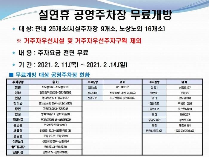 | ▲ 2021년 설 연휴 공영주차장 무료 개방 안내문. (사진제공=마포구청) |