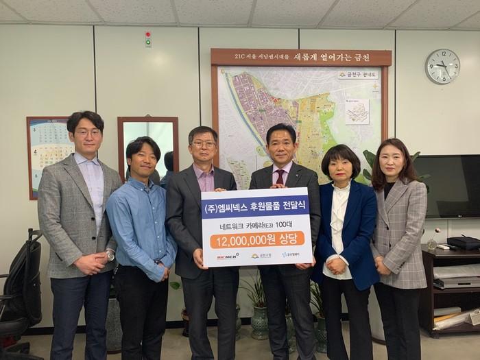 최근 (주)엠씨넥스가 지역사회 취약계층을 위해 서울 금천구에 차세대 IoT 카메라 100대(환가액 1200만원 상당)를 기부했다. 이날 복지가족국장실에서 이태홍 복지가족국장, 오민교 (주)엠씨넥스 부사장, 고성훈 (사)글로벌쉐어 대표가 참석한 가운데 전달식이 진행됐다. 사진은 관계자들이 기념촬영을 하는 모습. (사진제공=금천구청)