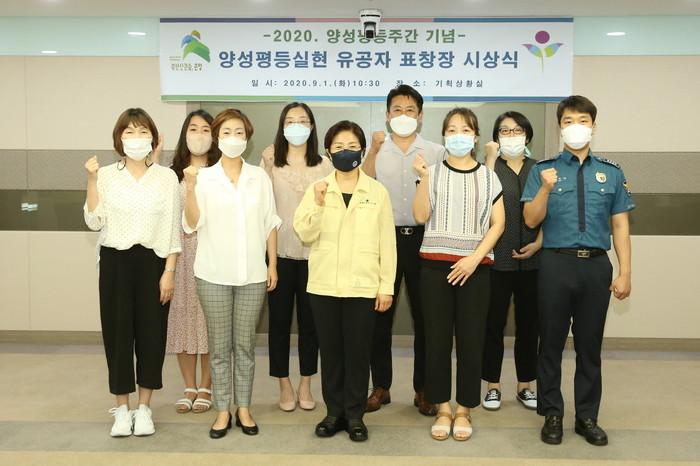은평구는 지난 1일 양성평등 실현에 기여한 유공자 표창장 시상식을 개최했다. 이날 양성평등 촉진, 여성인권 보호 및 권익증진 분야에 기여한 유공자 총 8명(개인 7명, 1개 기관)이 수상했다. 사진은 시상식에서 김미경 구청장(앞줄 가운데)과 수상자들이 기념촬영을 하는 모습. (사진제공=은평구청)