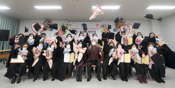경기 오산시는 24일 오산신용협동조합에서 2020학년도 오산백년한글학교 성인문해교육 졸업식을 개최했다. 오산백년한글학교는 화성오산교육지원청으로부터 학력인정기관으로 공식 지정된 곳으로 배움의 기회를 놓친 18세 이상의 초등학교 졸업자 및 동등학력 성인을 대상으로 교육과정을 운영하고 있다. 사진은 졸업식에 참석한 곽상욱 시장(앞줄 가운데) 및 졸업생들이 졸업 축하 세리머니를 하고 있는 모습. (사진제공=오산시청)