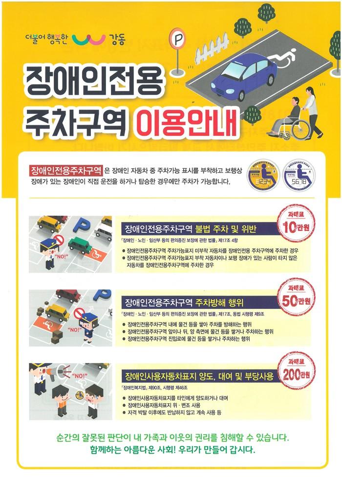 한편 구는 현장점검과 장애인전용주차구역에 대한 주민들의 이해 증진과 장애인들의 이동권 보장을 위해 ‘장애인전용주차구역 홍보 캠페인’도 함께 진행한다.
