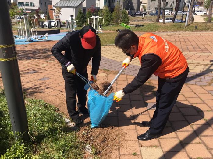 세종시 아름동이 24일 주민, 공무원 등 25명이 참여한 가운데 '2020년도 4월 국토대청결 운동'을 전개했다. 이날 참가자들은 아름동 오가낭뜰 근린공원과 인근 단독주택부지 등 지역내 취약지역을 중심으로 방치된 쓰레기를 수거했다. 사진은 쓰레기 수거 모습. (사진제공=세종시청)