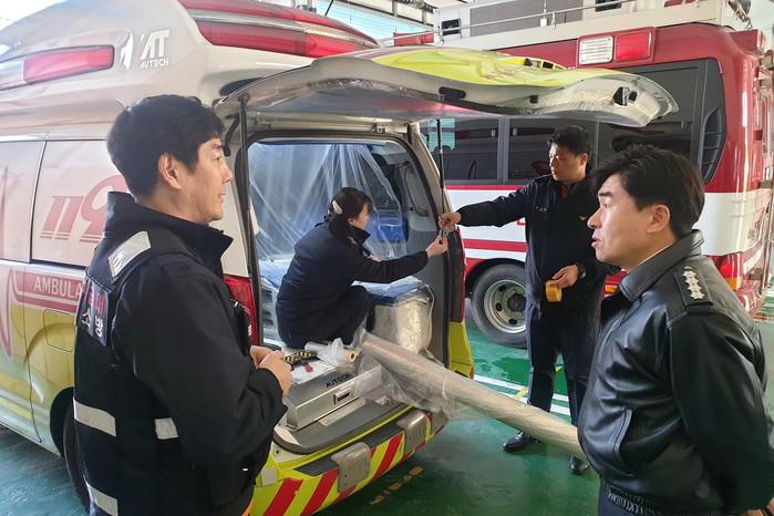 서울 도봉소방서는 최근 신종 코로나바이러스 감염증(우한 폐렴)이 확산됨에 따라 감염 의심환자 이송 전담 구급대를 지정하는 등 선제적 대응태세에 총력을 기울이고 있다. 사진은 소방대원들이 환자 이송시 감염 확산경로를 차단하기 위해 구급차를 점검하고 있는 모습. (사진제공=도봉소방서)