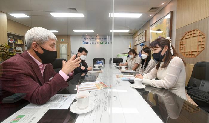 경기 오산시가 25일 오산대학교 평생교육원과 공무원 교육훈련의 질 제고와 인프라 확대를 위한 관·학 협력 협약을 체결했다. 협약에 따라 두 기관은 오산시 소속 공무원의 위탁교육 과정 협력 등을 협력하기로 합의했다. 사진은 곽상욱 시장(왼쪽)과 관계자들이 협약식에서 대화를 나누고 있는 모습. (사진제공=오산시청)