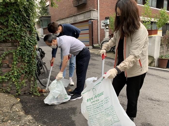 종로구 이화동 건강 걷기 동아리 '이화동 낭만산책' 회원들은 최근 가을을 맞아 2개조로 나눠 낙산공원과 마로니에 공원 일대를 가볍게 걸으면서 버려진 쓰레기를 수거하는 활동을 펼쳤다. 사진은 이날 이화동 낭만산책 회원들이 쓰레기를 줍고 있는 모습. (사진제공=종로구청)