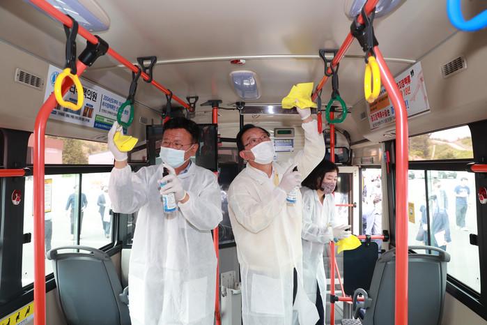 8일 울산시 울주군 청량읍 덕하공영차고지에서 시내버스 방역 소독이 이뤄지고 있다.