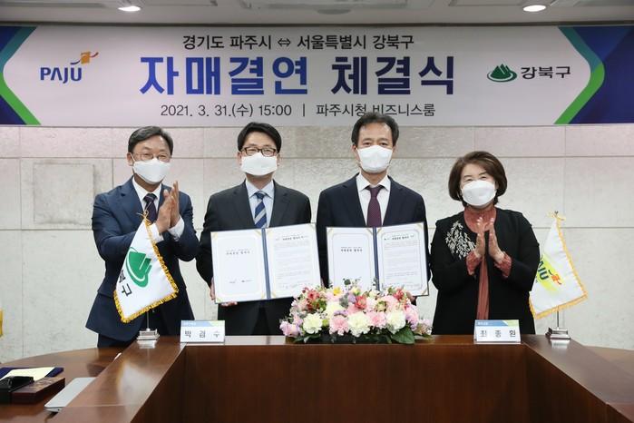 서울 강북구가 경기 파주시와 31일 자매결연도시 협약을 맺고 관광·문화·경제 등 다양한 분야에서 교류협력을 전개하고 공동 발전방안을 찾기로 했다. 사진은 협약식에서 박겸수 구청장(오른쪽에서 두 번째)과 파주시장이 및 관계자들이 기념촬영을 하고 있는 모습. (사진제공=강북구청)