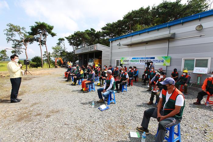 충남 서산시가 9일 임업기계창고에서 산림·녹지분야 관련 민간근로자 58명을 대상으로 안전교육을 했다. 이날 전문강사를 초빙해 안전사고 발생사례, 예방 및 대처 요령, 개인보호장구 창용 및 기계취급 요령 등을 교육했다. 사진은 이날 교육에 앞서 맹정호 시장(왼쪽)이 인사말을 하는 모습. (사진제공=서산시청)