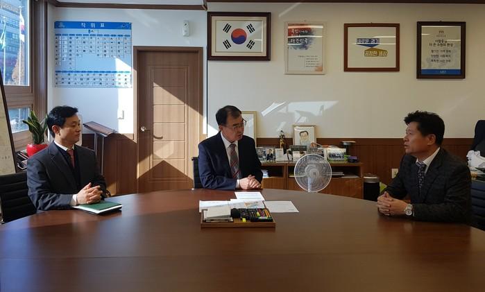 경기 수원시 영통구는 19일 구청장실에서 '이의지구' 지적재조사사업 측량대행자인 한국국토정보공사(LX) 수원지사와 간담회를 개최했다. 사진은 송영완 구청장(가운데) 및 관계자들이 이야기를 나누는 모습. (사진제공=영통구청)
