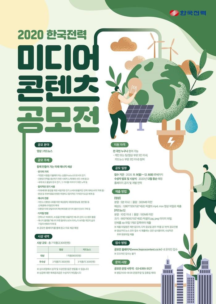 [시민일보 = 여영준 기자] 한국전력은 오는 12월8일까지 국민 누구나 참여 가능한 ‘2020 한국전력 미디어 콘텐츠 공모전’을 개최한다.