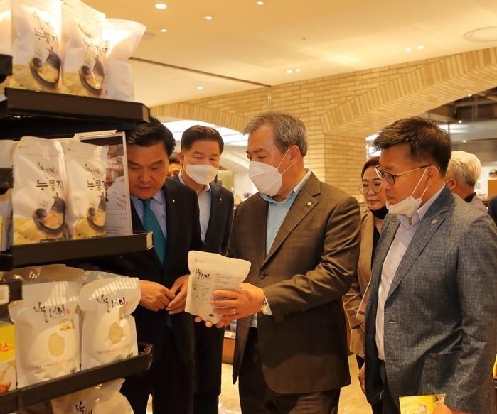 전남 곡성군의 백세미가 치솟는 인기에 힘입어 판매망이 전국 백화점으로 확대되고 있다. 현재 백세미는 전국 신세계백화점 13곳 중에 9곳에서 유통되고 있으며, 롯데백화점, AK플라자백화점 등에서도 유통을 앞두고 기획행사를 진행 중이거나 준비하고 있다. 사진은 롯데백화점 광주점을 방문한 유근기 군수가 유통되고 있는 백세미를 살펴보고 있는 모습. (사진제공=곡성군청)