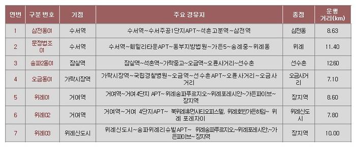 마을버스 노선을 구체적으로 살펴보면 ▲수서역과 삼전역 사이를 다니는 삼전동01번 ▲수서역과 위례동을 오가는 문정법조01번 ▲잠실역과 송파2동, 오륜사거리 사이를 운행하는 송파2동01번 ▲가락시장역과 오금사거리 사이를 다니는 오금동01번 등이 있다.