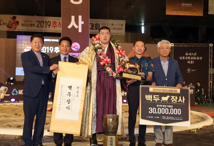 전남 영암군이 최근 영암실내체육관에서 전국의 씨름단 23개팀, 250명이 한데 모여 치열한 열전을 벌이는 ‘2019 추석장사씨름대회’를 성공적으로 개최했다. 사진은 백두장사 손명호(의성군청) 선수가 기념촬영을 하고 있는 모습. (사진제공=영암군청)