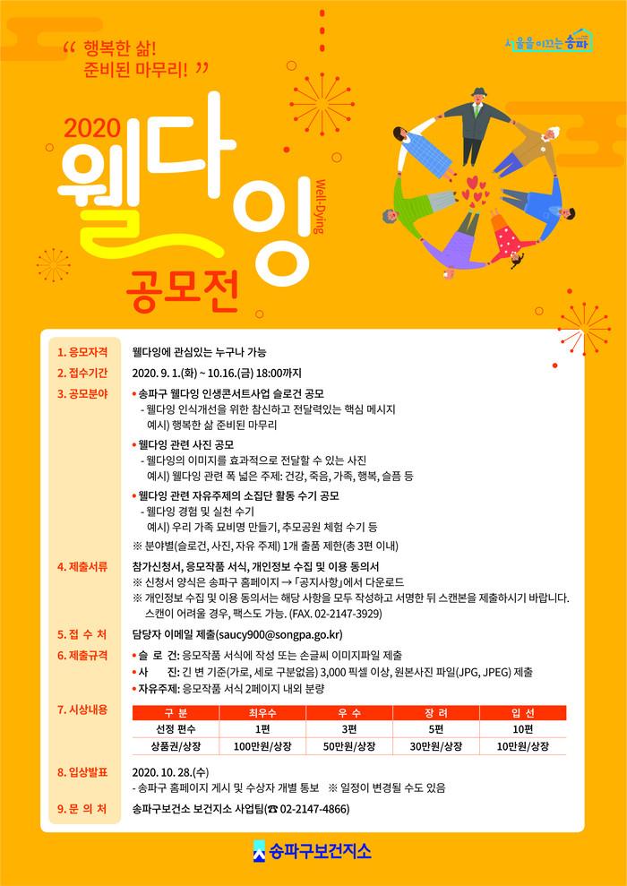 [시민일보 = 이대우 기자] 서울 송파구(구청장 박성수)가 오는 10월16일까지 주민들이 웰다잉(Well-Dying)에 대해 생각하는 계기 마련을 위해 ‘2020 웰다잉 공모전’을 실시한다.