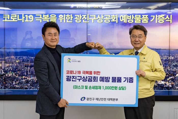 서울 광진구는 지난 7일 광진구상공회로부터 코로나19 예방을 위한 마스크, 손세정제 등 1000만원 상당의 방역물품을 기부받았다. 사진은 물품기증식에 참석한 김선갑 구청장(오른쪽)과 김석회 회장이 기념촬영을 하는 모습. (사진제공=광진구청)